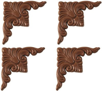 Decorative corner plates | Can frame virtually any size bath and vanity mirror without having to remove the mirror from the wall | Framing strips can be cut to size using a utility razor knife or chop saw if cutting in multiples |Corner Plates are used to finish off the corner areas of the newly framed mirror | No need to miter the corners, which makes for a quick and easy installation | Applied with the included double-faced tape squares in addition to small pea-sized dots of Adhesive Glue | Royal oak | 4 plates per pack